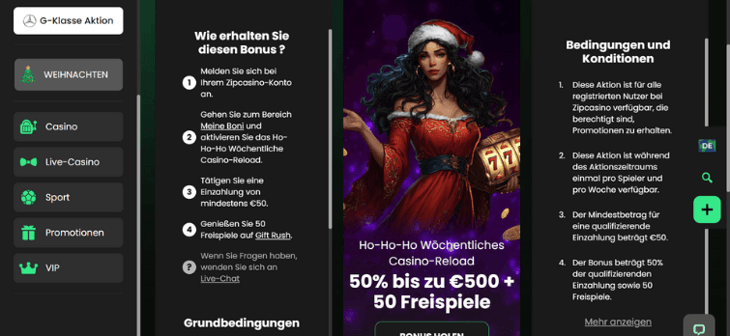 | 8. | ► Zip Casino | Ho Ho Ho Wöchentliches Casino Reload | 50 % bis 500 € + 50 Freispiele |