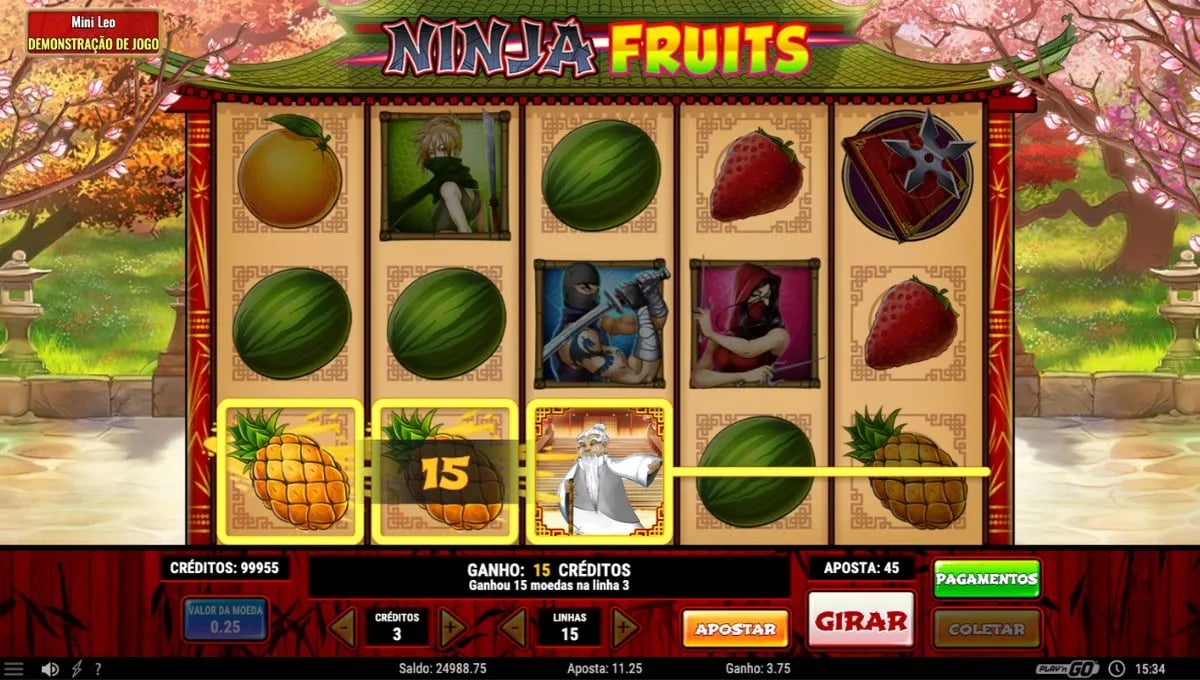 Em primeiro lugar da lista, temos o jogo de frutas Ninja Fruits da Play'n GO, que combina o tema de frutas com uma estética oriental e ninja. O Ninja Fruits foi escolhido como o melhor jogo de frutas online devido à sua combinação única de gráficos vibrantes e mecânicas de jogo inovadoras. Com o maior RTP da lista de 96,65%, 15 linhas de pagamento e volatilidade de caça-níquel média, este jogo oferece uma experiência envolvente e a possibilidade de grandes prêmios tornam este jogo uma escolha popular entre os jogadores de cassino online..