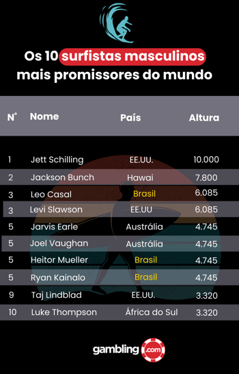 Na liderança isolada está Jett Schilling, dos Estados Unidos, seguido por Jackson Bunch, do Havaí. Mas a partir da terceira colocação, o Brasil divide o pódio com o mundo. Leo Casal e Heitor Mueller conquistaram a inédita marca de terminarem a temporada empatados em terceiro lugar, ambos com 6.085 pontos. Ryan Kainalo, outro talento promissor do país, também aparece empatado em quinto lugar com 4.745 pontos, dividindo a posição com os australianos Jarvis Earle e Joel Vaughan.