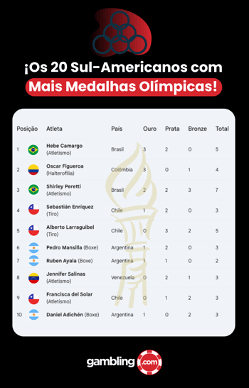 De acordo com a análise da Gambling.com, uma premiada empresa de marketing de desempenho e líder no fornecimento de serviços ativos de marketing digital para a indústria de jogos de azar online, O Brasil conta com os atletas entre os 10 sudamericanos que conquistaram mais medalhas na história dos Jogos Olímpicos.