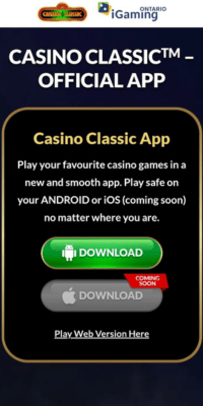 The Casino Classic casino app is available for download on Android devices alone, directly from the operator's site. The games load quickly and do not look different from how they appear on the mobile site.