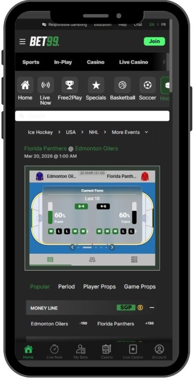 Bet99 runs a number of special offers for Canadian betting favourites like the NHL and is one of the league's official sportsbook partners.