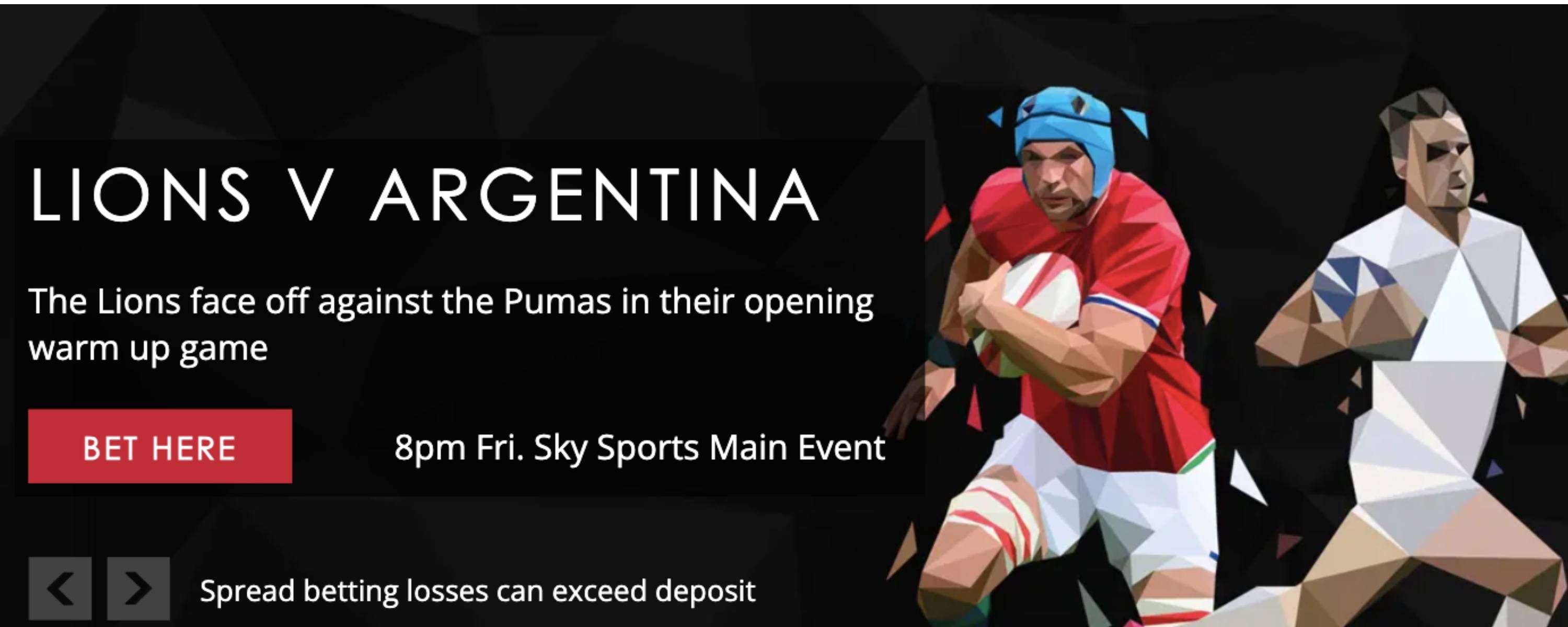 Spread betting markets include match supremacy (winning margin), total points and total tries.