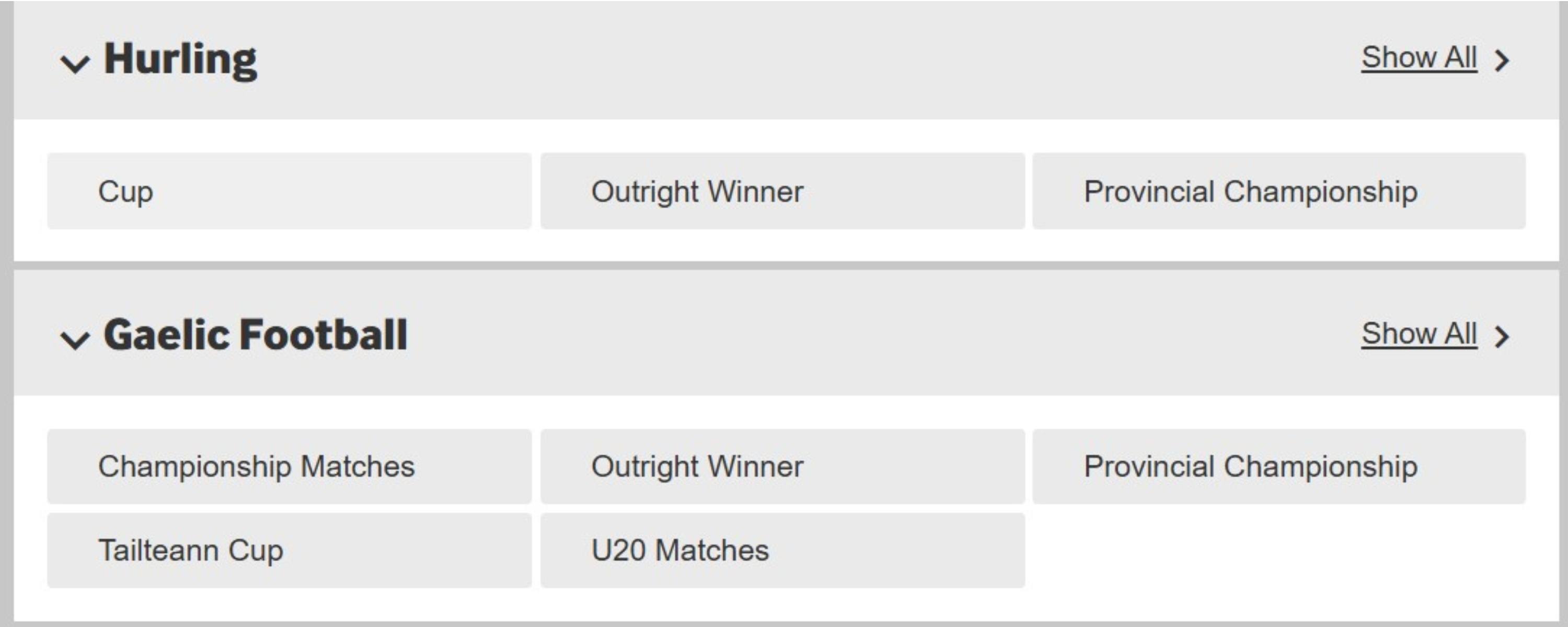 It's not just the biggest competitions - as there are markets available for the likes of the Tailteann Cup, as well as Under-20 hurling and Gaelic football matches.
