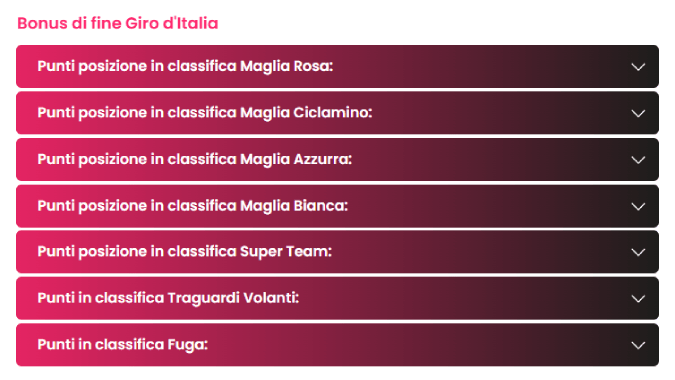 Di seguito invece ti offriamo una grafica per riassumere i bonus che potrai ottenere alla fine del Giro d’Italia: