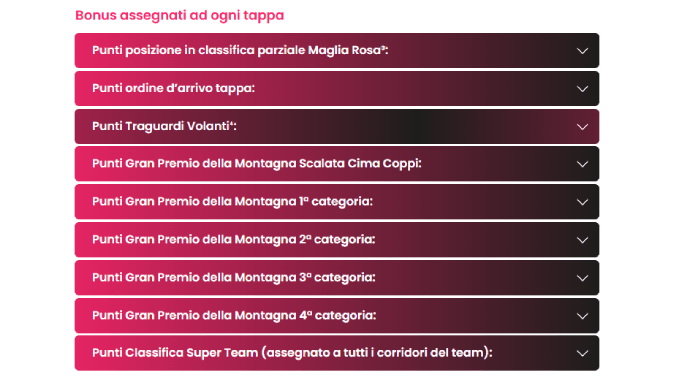 In questa grafica vedrai elencate le varie tipologie di bonus assegnati a ogni tappa: