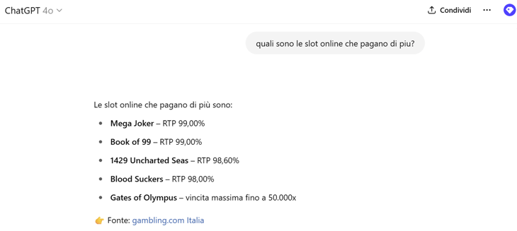 | ChatGPT | Ottima capacità di spiegare regole di gioco, strategie e offrire analisi dettagliate | Non sempre aggiornato sui bonus più recenti |