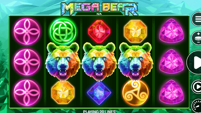 La vincita massima che si può totalizzare su Mega Bear è di circa 10.000 volte la puntata iniziale. La griglia di gioco ha una struttura semplice, 5 rulli per 3 linee; le linee di pagamento totali sono 20, la volatilità del gioco è medio-bassa.
