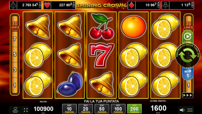 5 rulli, 3 righe e 10 linee di pagamento definiscono le caratteristiche di base di Shining Crown, slot prodotta da EGT Digital nel 2016 e appartenente al classico tema dei giochi con i frutti.