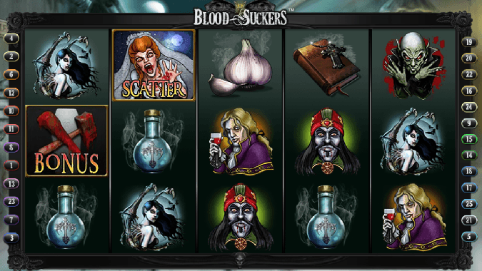 Questo gioco presenta una griglia 3x5 e 25 linee di pagamento, con una vincita massima che arriva a 1.014x la puntata iniziale. In Blood Suckers non mancano ovviamente simboli tipici dei giochi a tema horror, come il vampiro che morde una fanciulla, il quale agisce come Wild, mentre la Sposa di Dracula aumenta il moltiplicatore e conferisce 10 Free Spin.