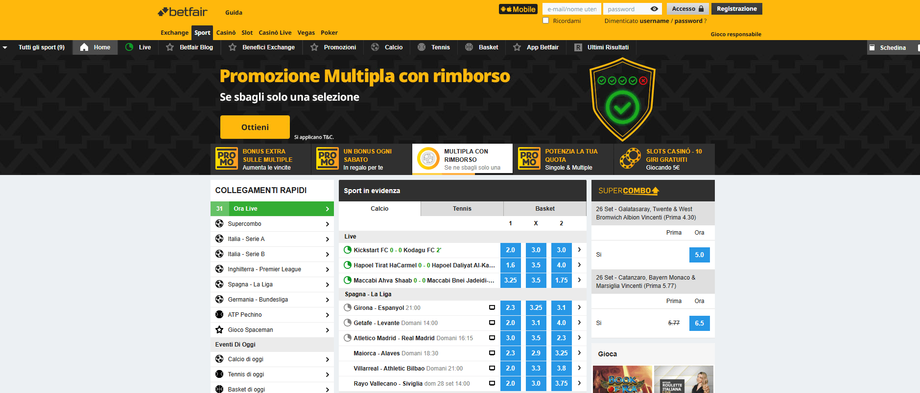 Betfair propone un bonus di benvenuto unico basato sul Betting Exchange: fino a 10€ di rimborso settimanale sulle perdite nette per 5 settimane. Sono inoltre disponibili promozioni ricorrenti come bonus multipla, assicurazione salva multipla e bonus speciali nel weekend.