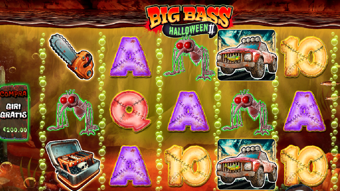 El pescador del clásico Big Bass Bonanza se disfraza en Halloween para llevarte a un lago embrujado en este slot de 5 carretes, 10 líneas y RTP de 96.71%.