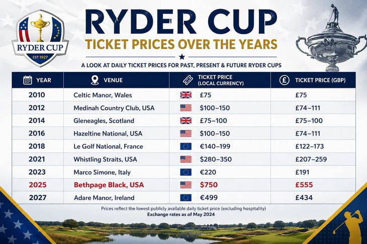 The numbers are stark. In 2010 at Celtic Manor, a matchday ticket cost around £75. By 2021 at Whistling Straits, that figure had risen to the equivalent of roughly £207–£259.