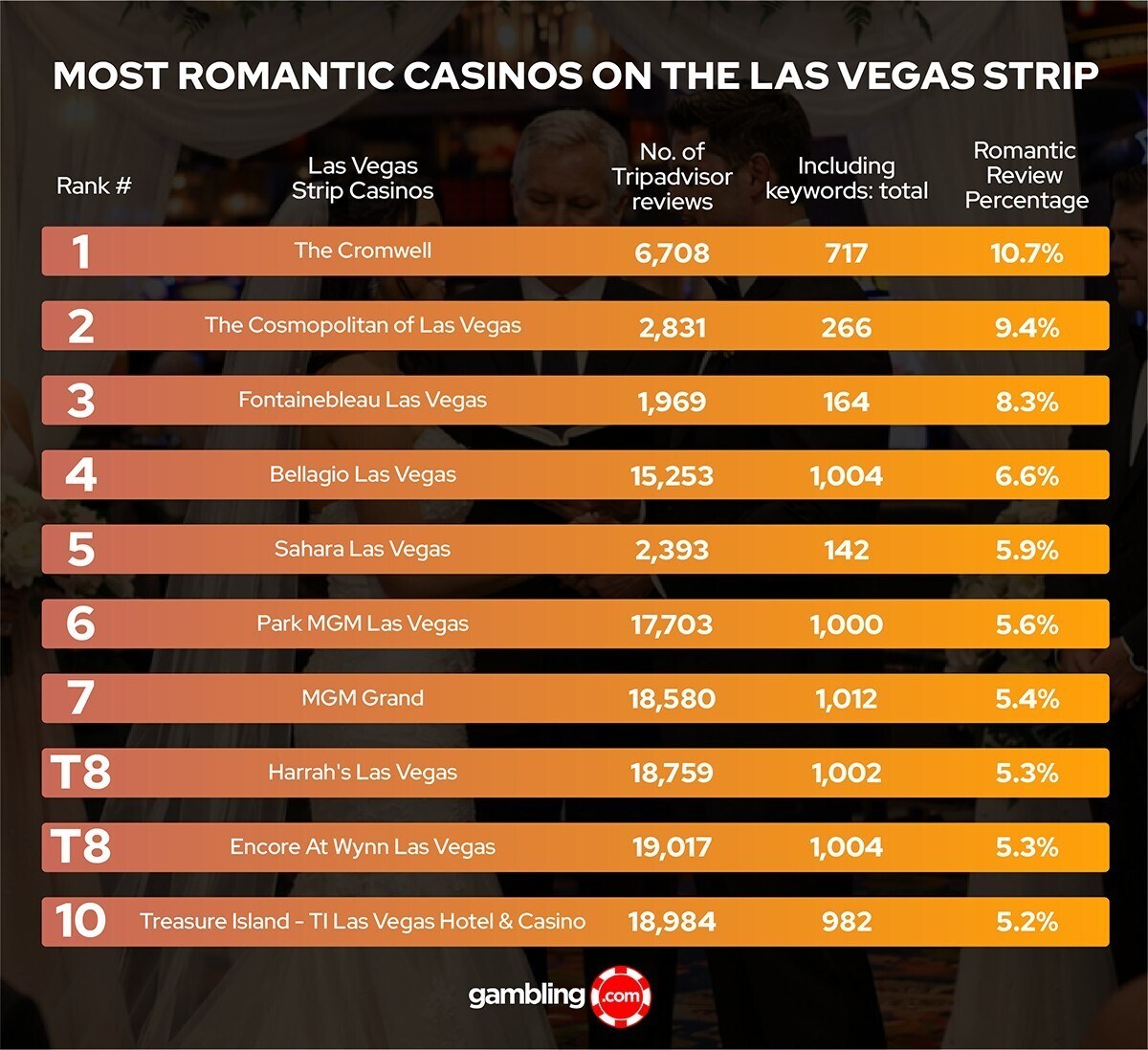 To find out the Most Romantic Casino on the Las Vegas Strip, Gambling.com analyzed TripAdvisor reviews of casinos located on the Las Vegas Strip for the keywords romance, love and affection.