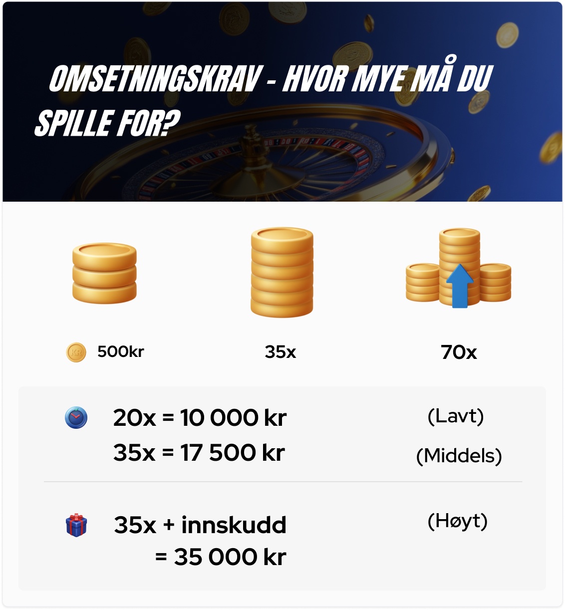 Vær særlig oppmerksom på om omsetningskravet gjelder kun for bonusen, eller for både bonus og innskudd. Mange casinoer opererer med krav som 35x bonus + innskudd, noe som i praksis tilsvarer 70x bonusbeløpet dersom det er en 100% casino bonus.