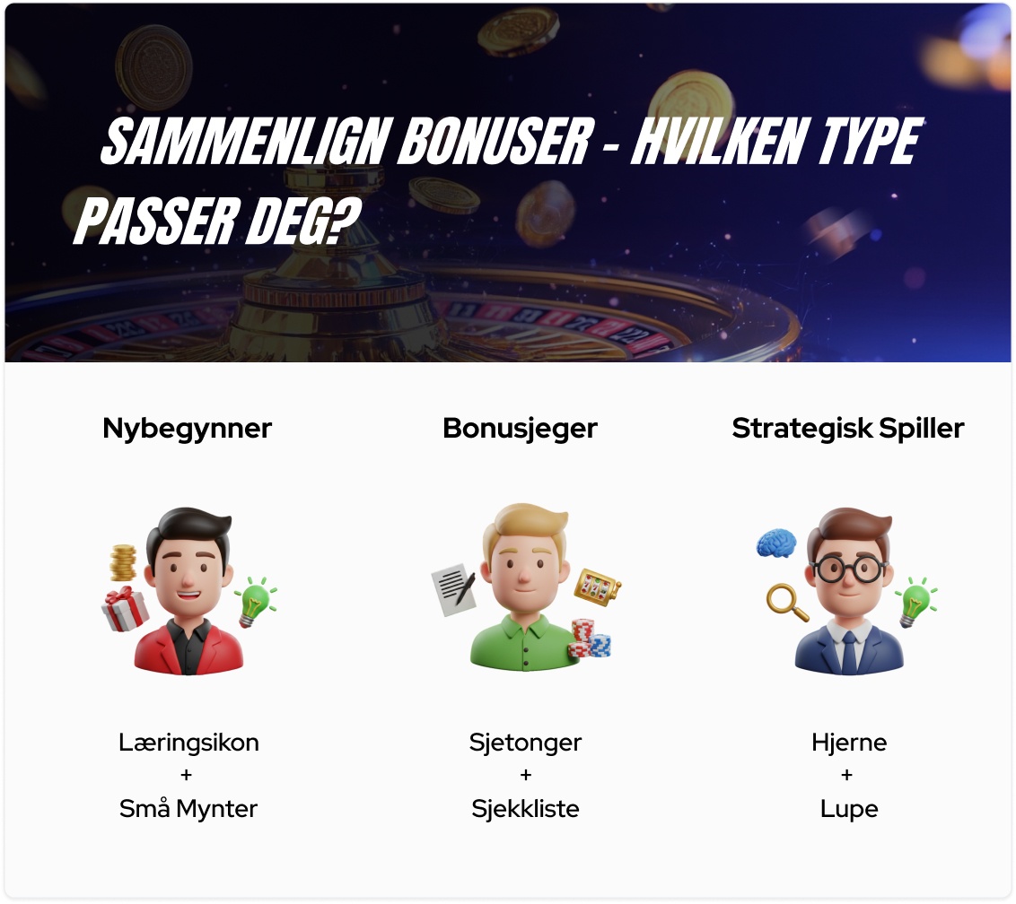 Målet er å hjelpe deg med å finne de beste bonusene i 2025, enten du er en ny spiller eller bare på jakt etter et godt tilbud. På denne siden går vi gjennom hva du bør se etter i en bonus og hvilke fallgruver du bør unngå når du bruker dem. I tillegg gjør vi bonusjakten så enkel som mulig ved å liste opp de beste alternativene du kan finne på nett akkurat nå.