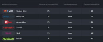 | Taxe și comisioane | Comision de 2% la depuneri / variabil la retragere în funcție de sumă | 2% la depunere / 3% sau mai mult la retragere | Comision la depunere și retragere |