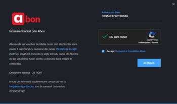 Intri în contul de jucător și accesezi casieria pentru a face o depunere cu Abon, selectezi metoda și inserezi suma pe care vrei să o depui