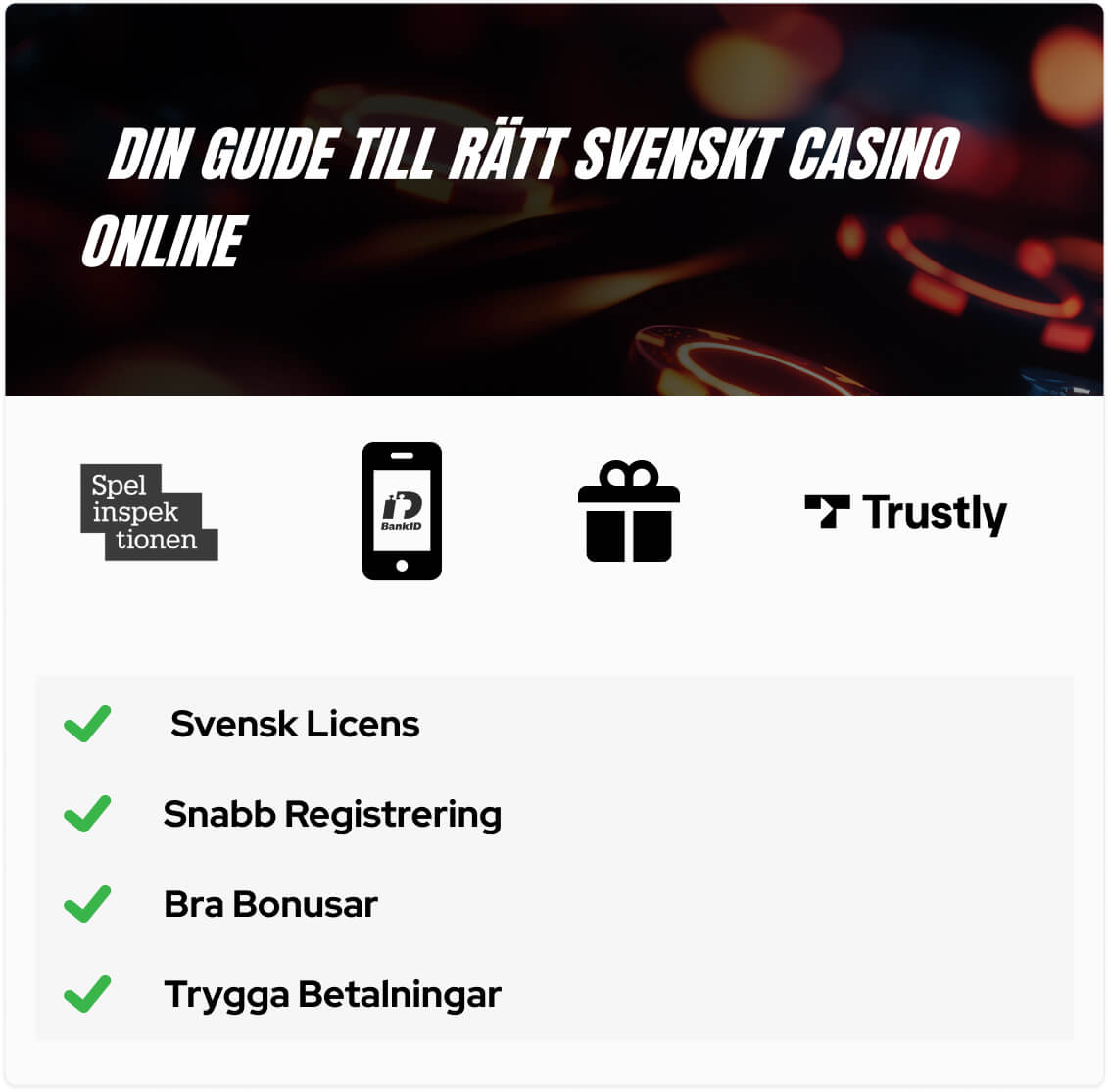 Vi har valt att endast lista svenska online casinon med korrekt licens för att garantera dig som besökare trygghet och säkerhet när du spelar. Har ett casino inte en svensk spellicens finns inte dessa garantier. Har casinot sin licens utanför EU är det 30% skatt på vinsterna och integrerade verktyg som Spelpaus, Självtest och Spelgränser finns inte tillgängliga.
