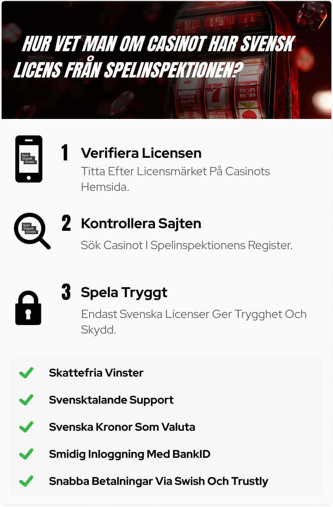 Alla svenska casinon online måste ha en licens från den svenska Spelinspektionen för att få agera på den svenska marknaden och mot svenska casino spelare. Att ha en svsnke licens innebär att casinot är helt säkert att spela på och att det granskar kontinuerligt och föjer de regler och lagar som gäller i Sverige.