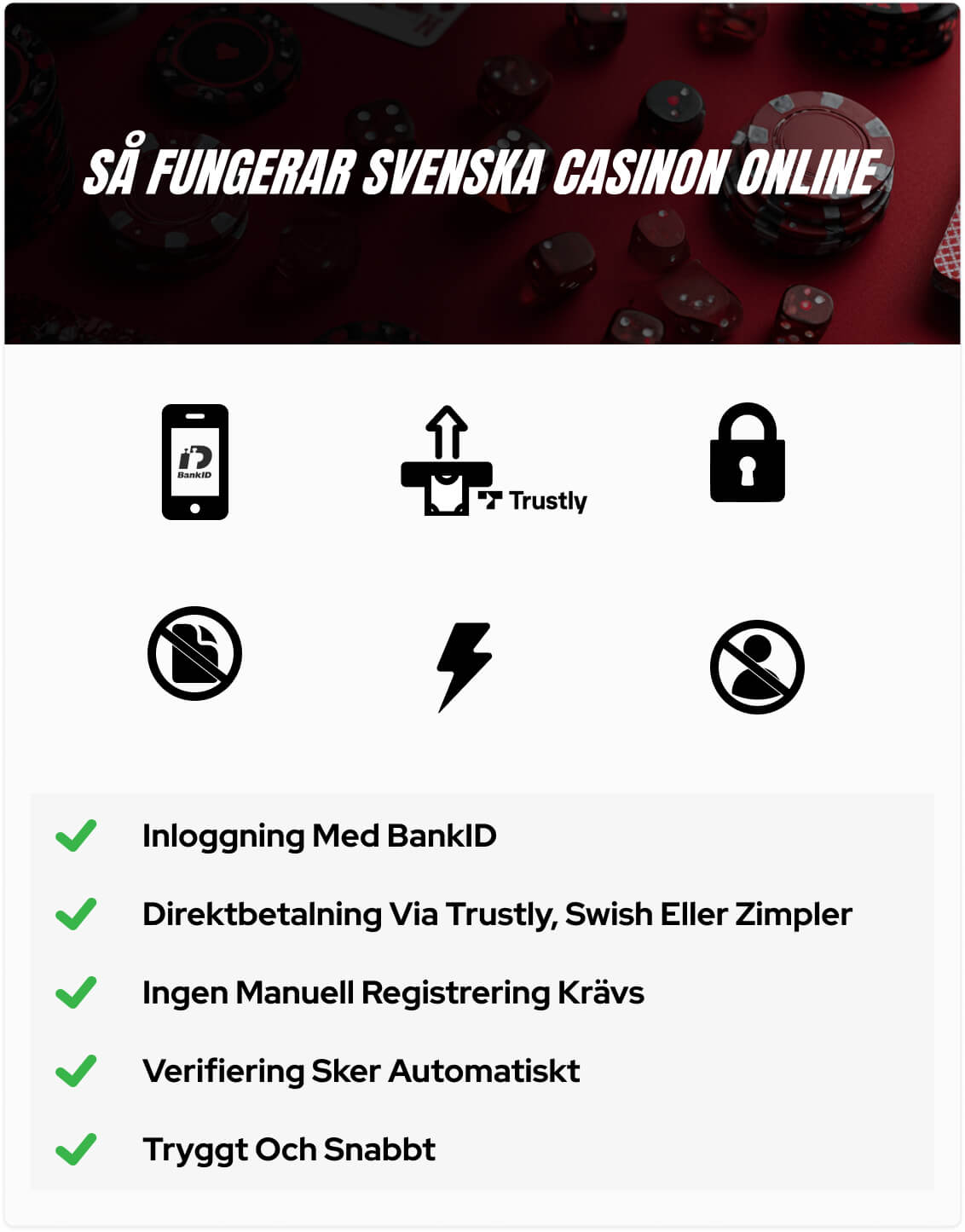BankID casinon är det som garanterar de blixtsnabba uttagen eftersom ingen ytterligare verifiering krävs. Casinon kan kräva KYC-dokument men det är väldigt sällsynt och brukar bara gälla mindre aktörer vid extremt stora uttag.