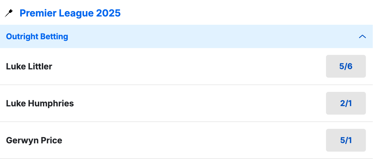 Odds-wise, I prefer BetMGM for the Premier League of Darts, where they consistently have the best prices.