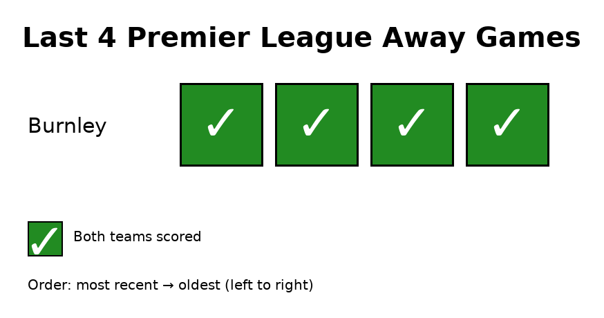 Both teams have a 50% BTTS record in the Premier League this season, but the Clarets have scored and conceded in their last four away games at Manchester City, Manchester United, Aston Villa and Wolves.