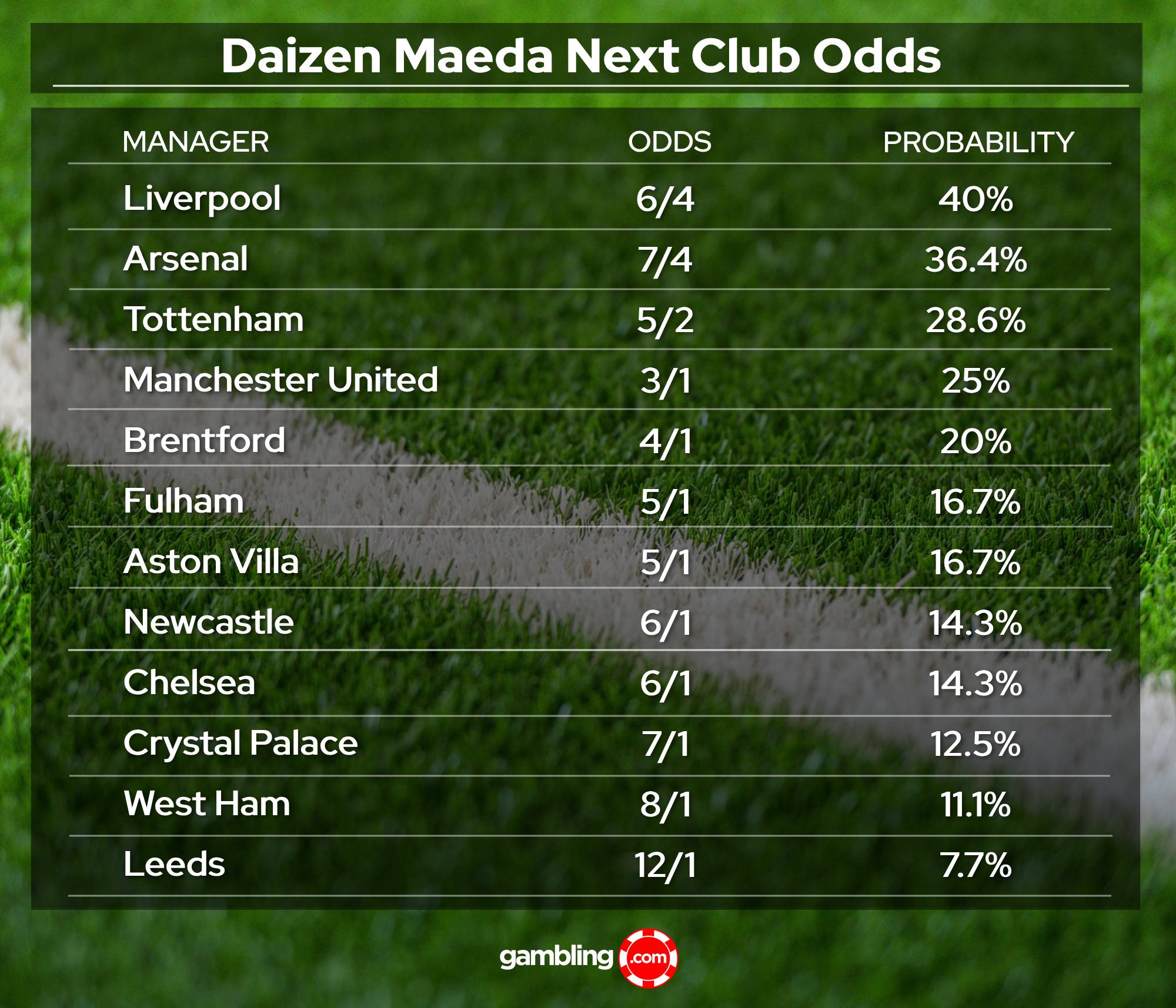 Other clubs interested in signing Maeda include Fulham (5/1), Aston Villa (5/1), Newcastle (6/1), Chelsea (6/1), Crystal Palace (7/1), West Ham (8/1) and Leeds (12/1).