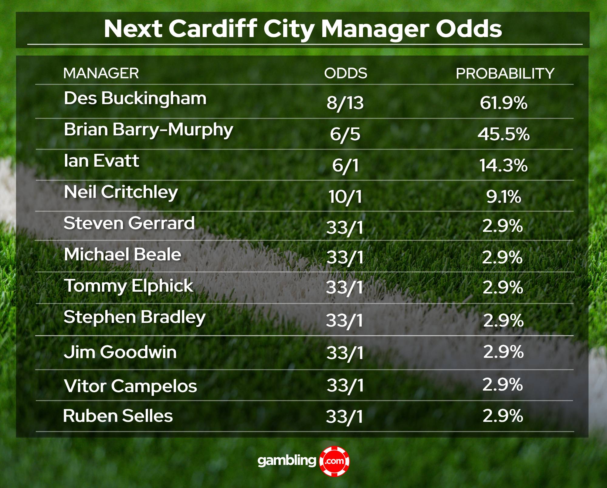 Des Buckingham and Brian Barry-Murphy remain the favourites with betting sites to be Cardiff's next manager.