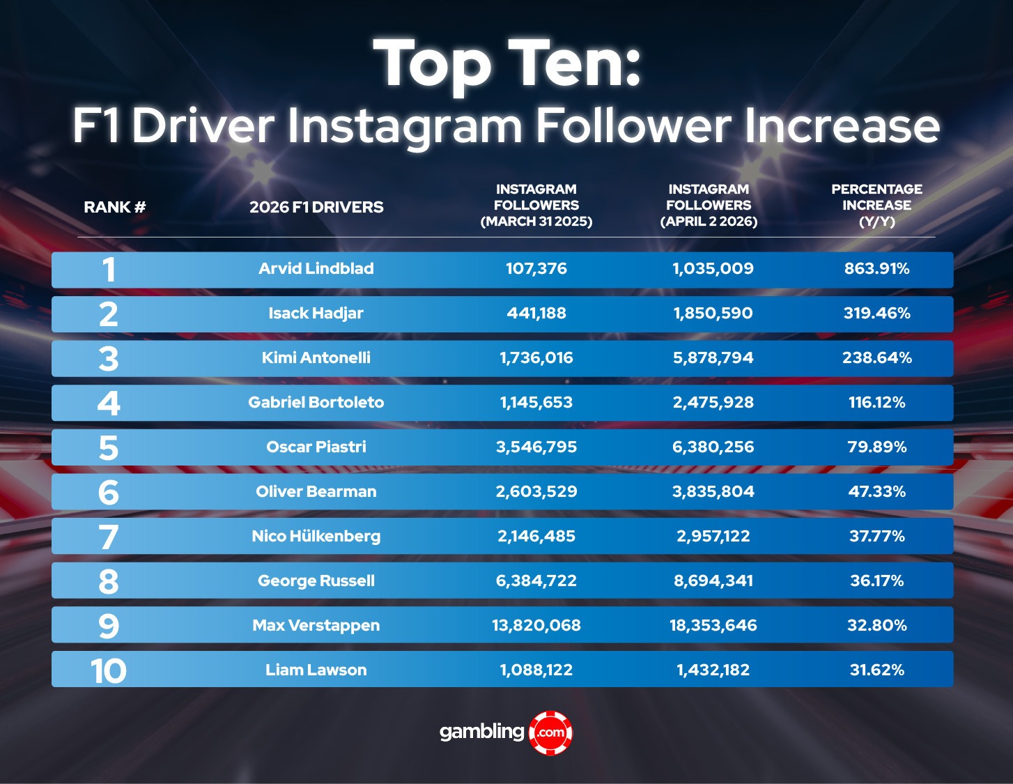 New research from Gambling.com, using Social Blade data to track Instagram growth across the current grid, reveals just how dramatically the sport's social landscape is shifting.