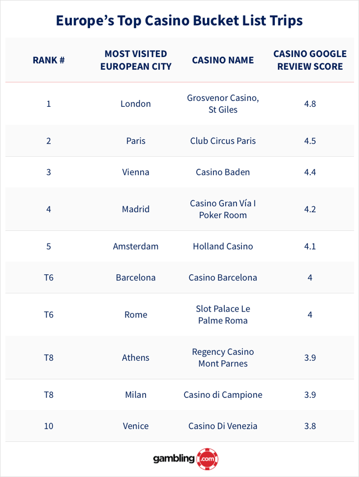 Based on Google Reviews and tourism data, the study showcases the best casino hotspot in each of Europe’s 10 most visited cities.